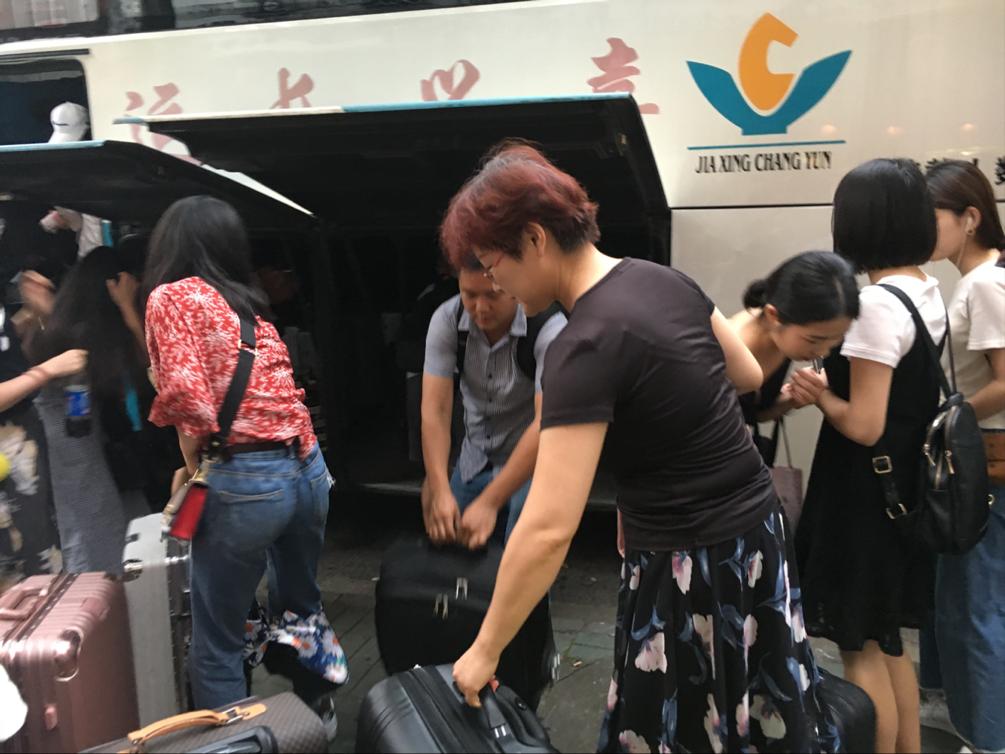 (大巴载着求知的莘莘学子,冒着酷热直赴电商之都——浙江义乌)