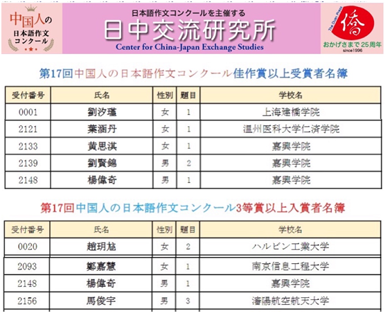 近日,经过长达4个月的严格评审,“第17届中国人日语作文大赛”获奖名单揭晓。我院日语专业学子的日语作文从来自全国27个省、直辖市和自治区的165所学校 3198篇投稿作文中脱颖而出,杨伟奇同学获三等奖,黄思淇和刘贤锦两位同学分获佳作奖,指导教师周艳君老师获“优秀园丁奖”。