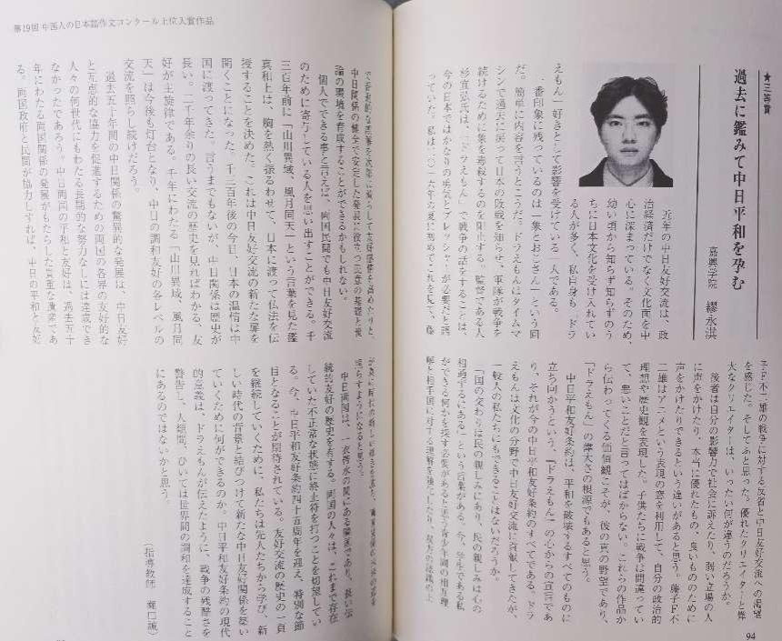 经过大赛选考委员会最终复审和口述审查,缪永淇同学在日本外教濑口诚老师的悉心指导下完成的“過去に鑑みて中日平和を孕む”一文与其他获奖的61位选手的作文一并被收入到《运用围棋智慧 共促中日交流 ——中国青年用日语描绘未来的视界》一书中,目前该书已在日本公开出版发行。