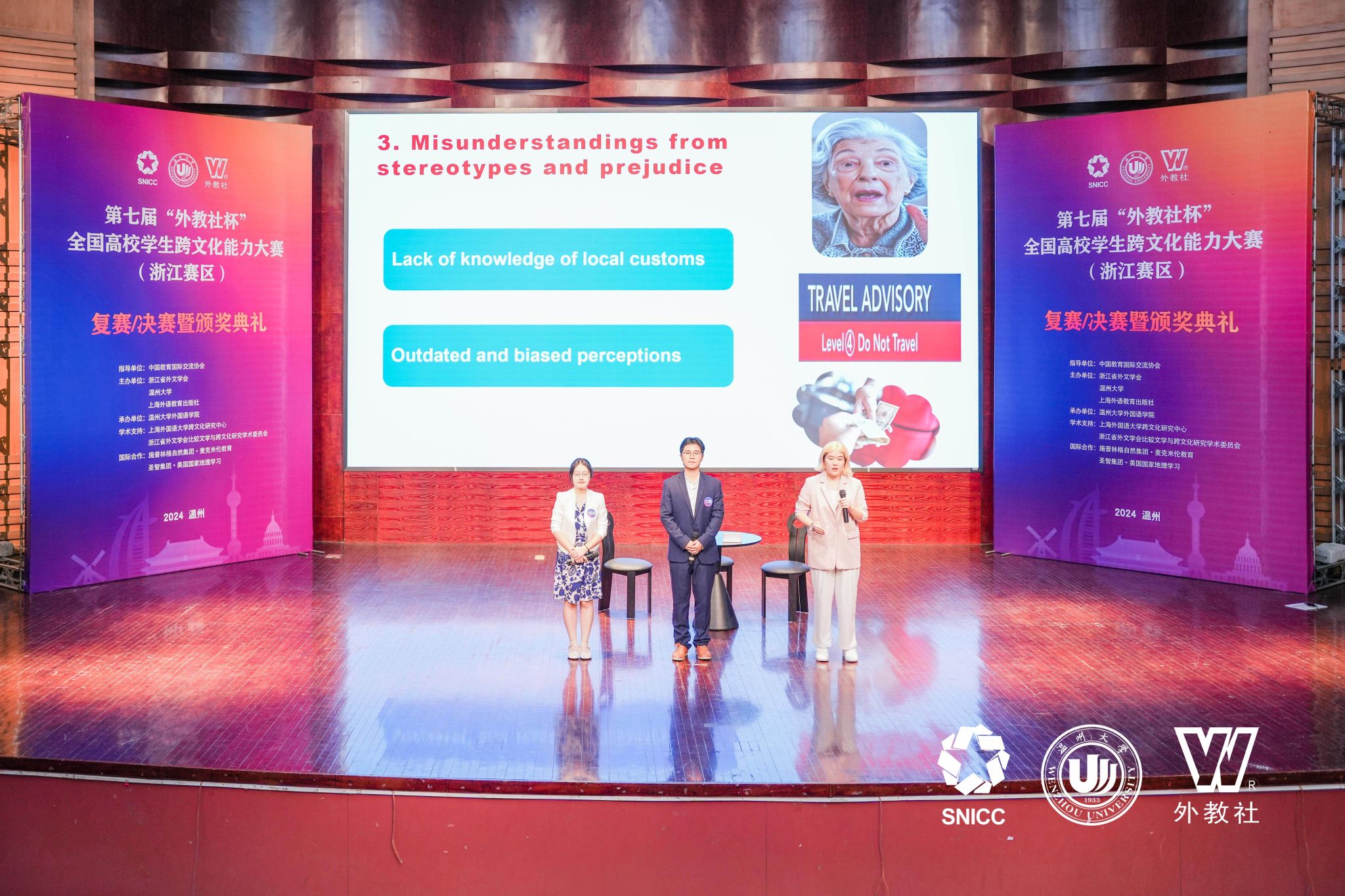 11月16日至17日,第七届“外教社杯”全国高校学生跨文化能力大赛浙江赛区(英文组赛道)在温州大学成功举办,吸引了来自浙江省30所高校的代表队参加。由外国语学院陶丹玉、罗国华和鲁俊丰老师指导的学生向海涛、项夕雅和周子璇三位选手代表嘉兴大学参赛获得省级一等奖,其中向海涛同学获得“最佳思辨奖”。这是我校学生在该项赛事获奖上取得的新突破。