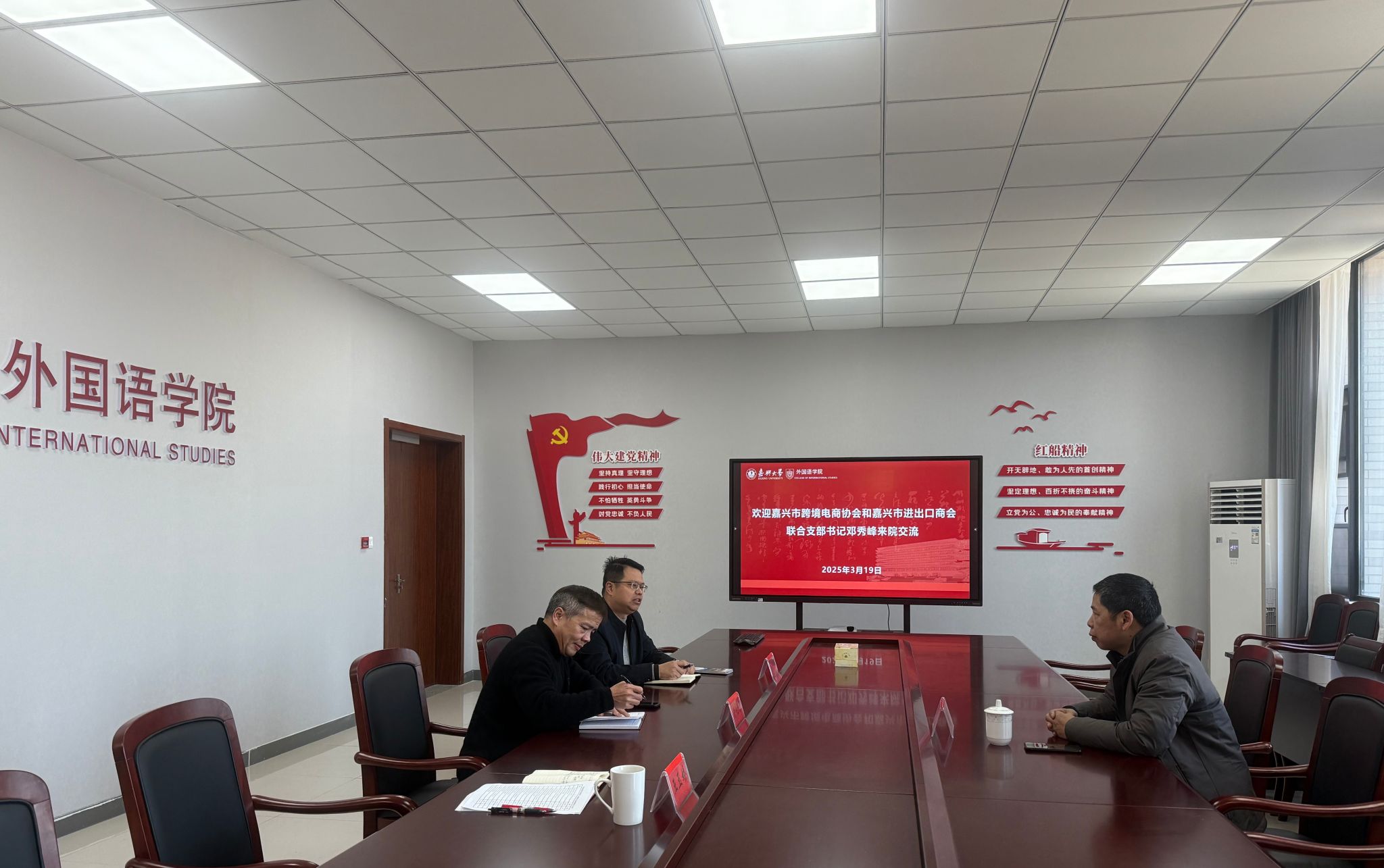 3月19日,嘉兴市跨境电商协会和嘉兴市进出口商会联合支部书记邓秀峰应邀来院交流,双方围绕本科生访企拓岗和翻译硕士研究生实习实践基地建设等内容进行洽谈。学院院长唐艳芳参加会议,党委副书记张啸峰主持会议。