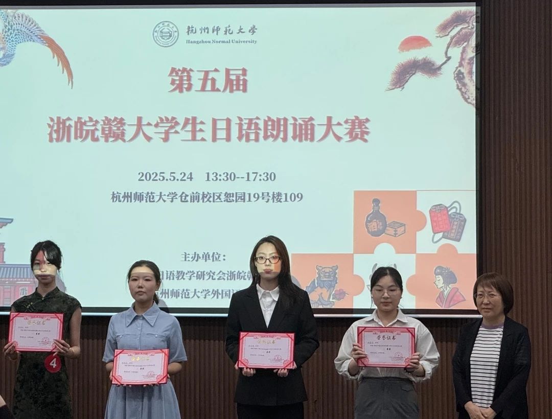 “浙皖赣大学生日语朗诵大赛”是由中国日语教学研究会浙皖赣分会和杭州师范大学外国语学院共同举办的一项大赛,至今已举办四届,我校日语学子已先后获得二等奖、三等奖和一等奖的好成绩。此次获奖既是对学生专业能力的肯定,也彰显了我校外语人才培养的显著成效。我们将继续完善“以赛促学、以赛促教”的培养机制,为培养具有国际视野的高素质日语人才而不懈努力。