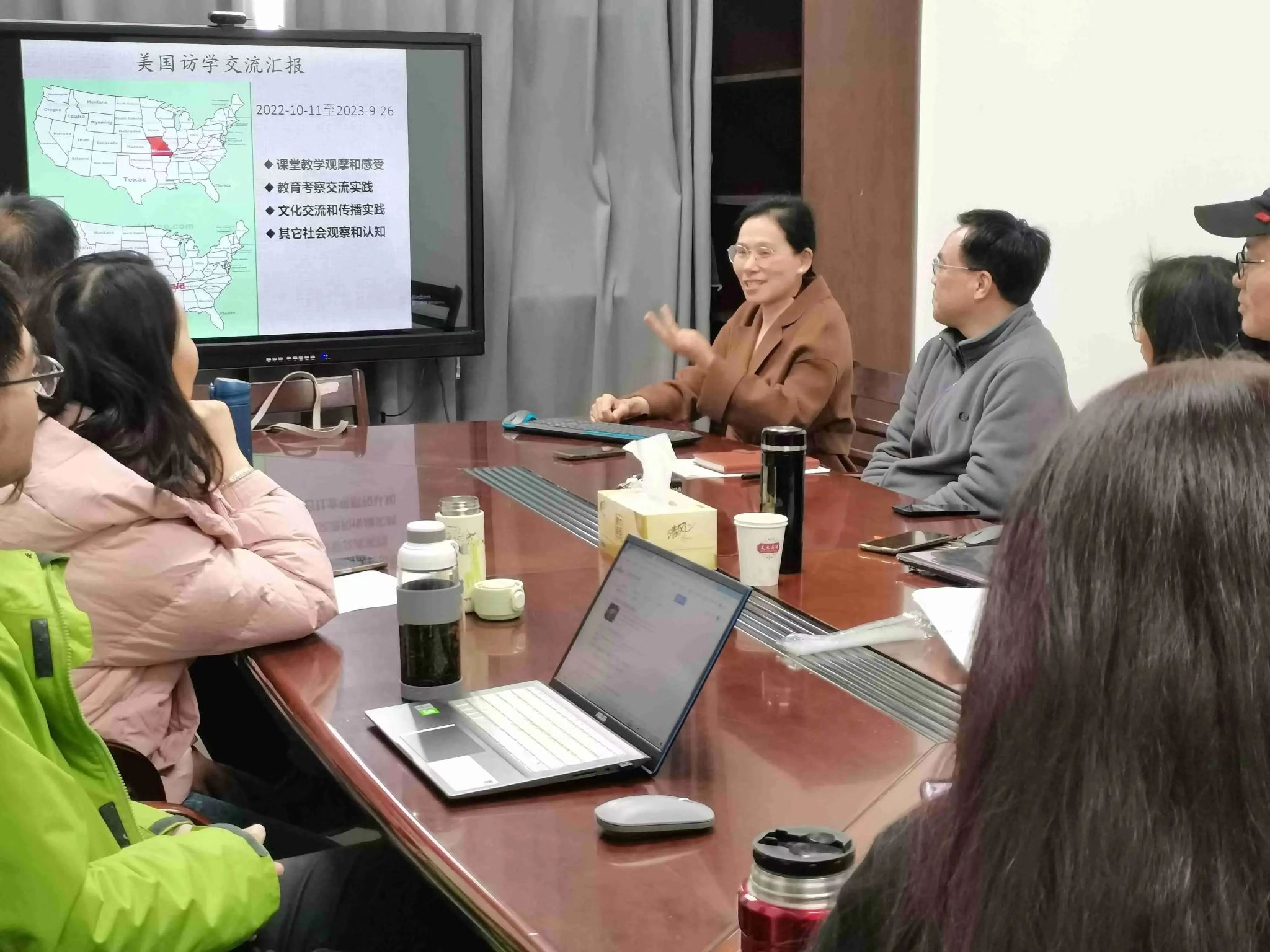 陶教授从四个方面分享了在美国密苏里州立大学访学期间的经历和感受,包括课堂教学观摩、教育考察和交流、文化交流和传播,以及其它社会观察和认知。除参与密苏里州立大学的课堂教学观摩与交流研究之外,陶教授还主动考察了几所中、小学和专科学校,真切感受到美国学校以学生为主的理念和自由活泼的管理氛围。本着文化传播与交流的强烈意识,陶教授访学期间积极参与了多种文化传播和交流活动, 给密苏里州立大学本科生做了题为“中国文化里的集体主义”讲座,受到师生好评。此外,陶教授分享了对美国社会的观察和认知。陶教授认为,在跨文化交际实践中应该强化民族身份意识、扬长避短、洋为中用、传播中国文化,增强文化自信。