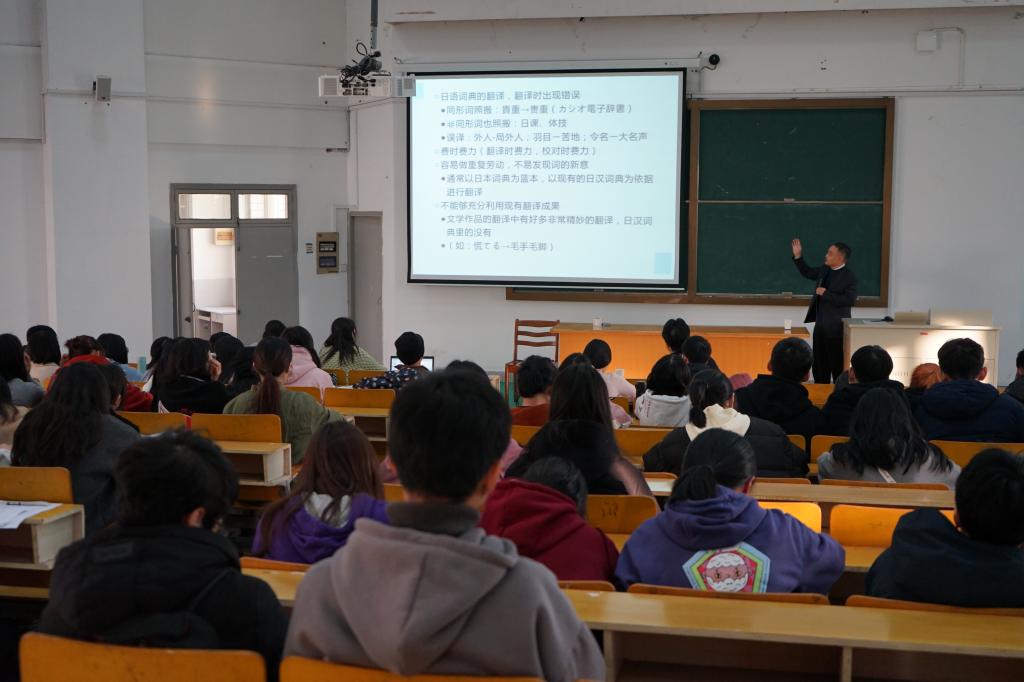 2019年12月12日下午,上海外国语大学施建军教授莅临我院,在外语楼310做了一场题为“关于中日近义词的互译性问题”的学术讲座。讲座由外国语学院副院长郭永恩教授主持,日语系全体教师和数名英语系教师以及百余名日语专业学生积极参加了讲座。