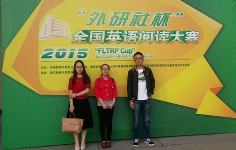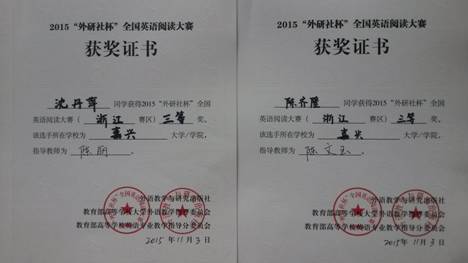 2015年首届 “外研社杯”全国英语阅读大赛复赛(浙江赛区)于10月24日在浙江财经大学下沙校区举行。嘉兴学院共选派三位选手参赛,其中外国语学院英语131班沈丹萍和南湖学院英语N142陈齐隆同学分别获得三等奖。首战告捷,成绩可喜,向这些获得佳绩的同学表示祝贺。外国语学院陶丹玉、陈文玉、陆晓琴、程雄、陈丽老师等为本次大赛的初赛组织和选手选拔付出了辛苦劳动,在此向他们同时也向外院其他默默无闻、无私奉献的老师们表示致敬和感谢!