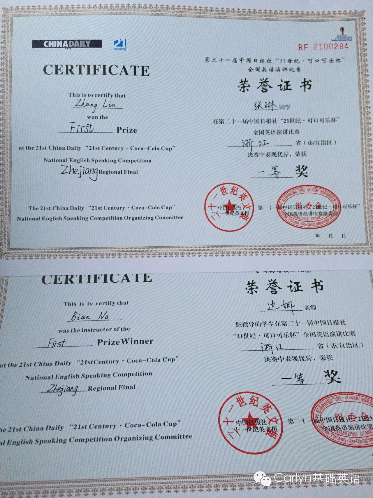 第21届中国日报社“21世纪·可口可乐杯”全国英语演讲比赛浙江省决赛于12月5日在浙江大学城市学院举行,来自全省各个高校的36名选手参与角逐。嘉兴学院派出外国语学院英语122班张琳同学参赛,她在大赛中表现优秀,从众多参赛选手中脱颖而出,获得一等奖的佳绩!
