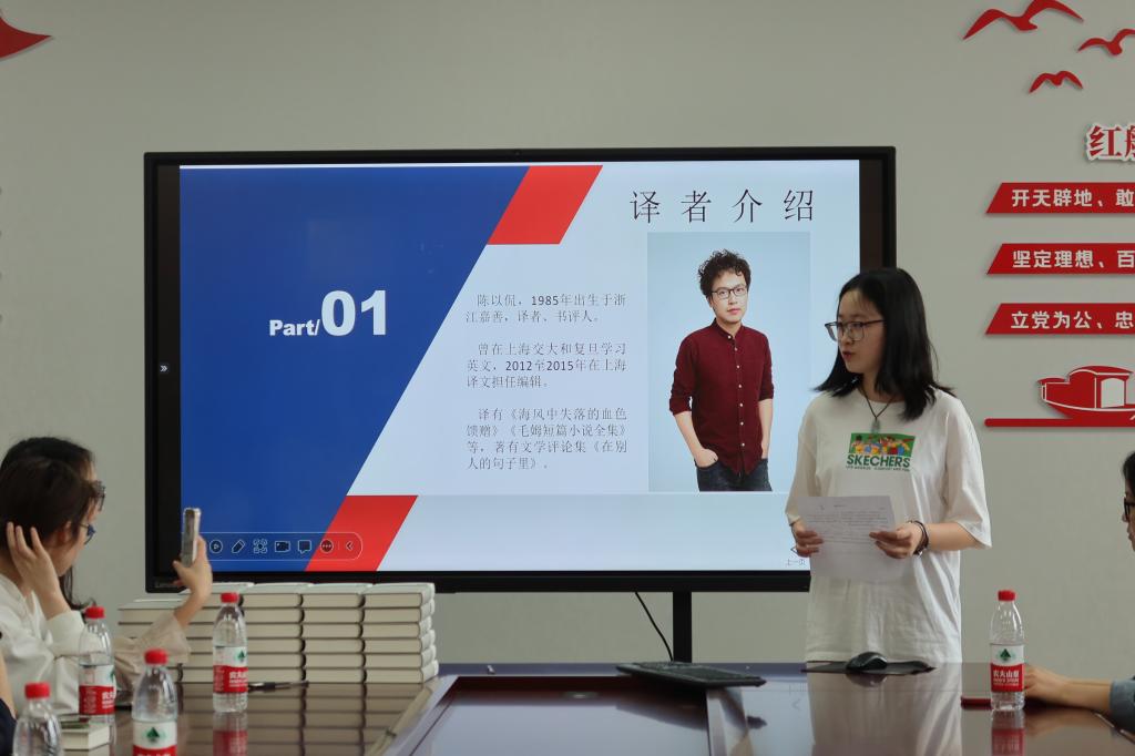 活动伊始,陈以侃向大家介绍了个人喜欢的几位外国文学作者以及作品。陈老师结合自身的阅读经历向大家推荐了几本必读书篇,他表示“阅读,与书的相遇是一种奇妙的结合”。他还和大家分享了自己的第一部翻译作品——《海风中失落的血色馈赠》,与大家交流了翻译技巧。他强调在翻译过程中不能刻意模仿外语的腔调,而是要感受原著作者的情感,再通过中文语言习惯如实地传递其思想。