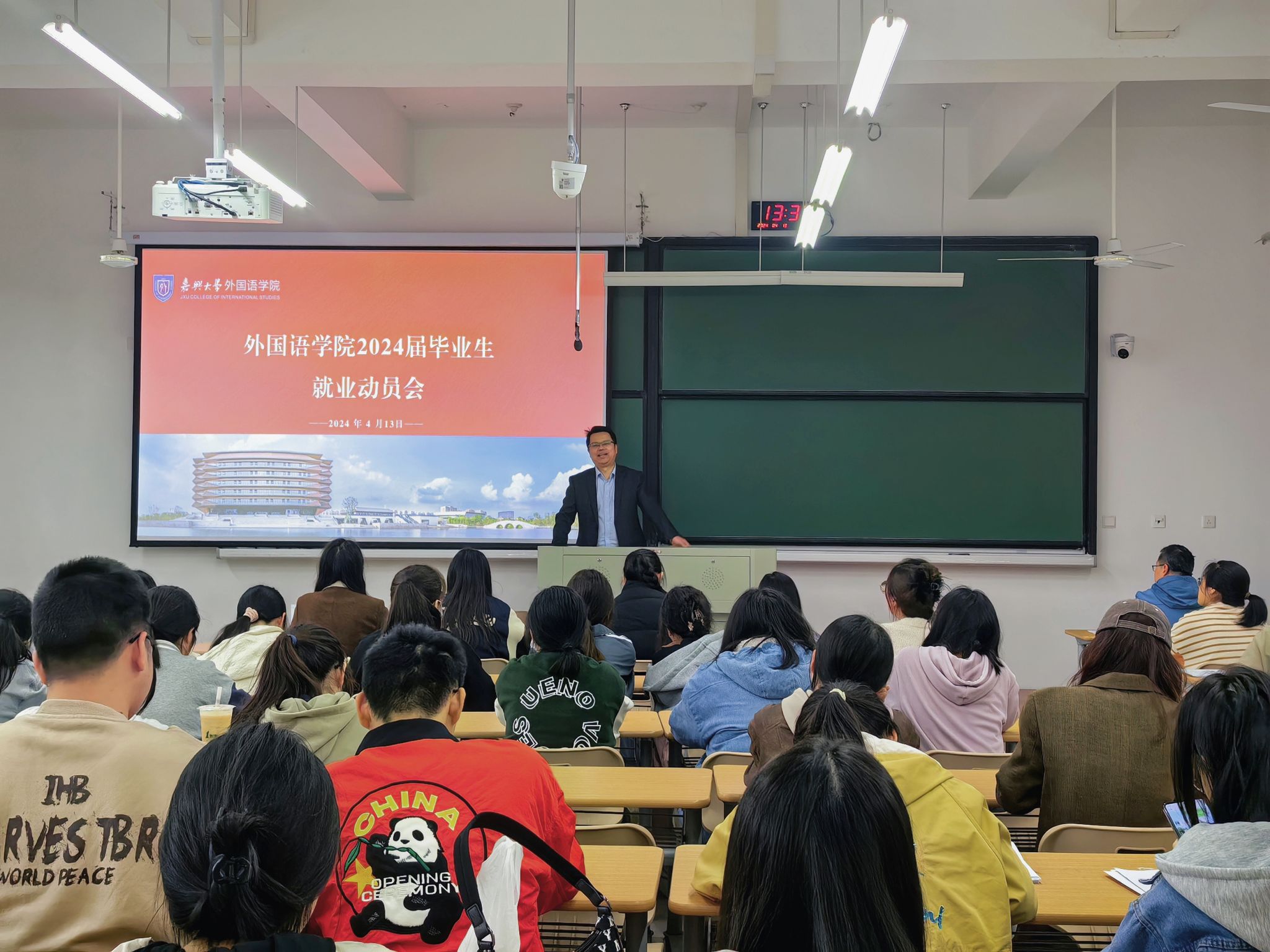 4月13日下午,外国语学院2024届毕业生就业推动会于兴德楼南楼203教室召开。学院党政领导、系主任、2024届全体毕业生、辅导员参会。会议由学院党委副书记张啸峰主持。