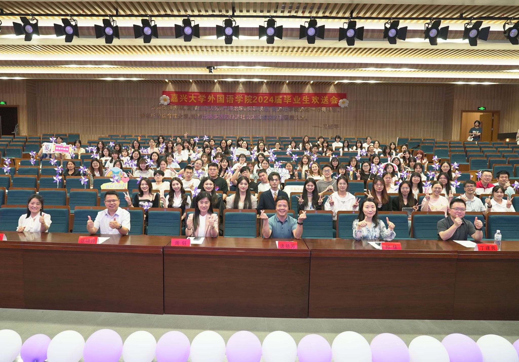 不负嘉大,不负韶华。教师代表鲁俊丰、张艳琴老师分别为毕业生们送上祝福:在未来的道路上学会“悦纳”自己,常回“嘉”看看。毕业生代表陈雪菲代表全体2024届毕业生表达了对老师与同学的深厚情谊与对未来嘉大的美好祝愿。