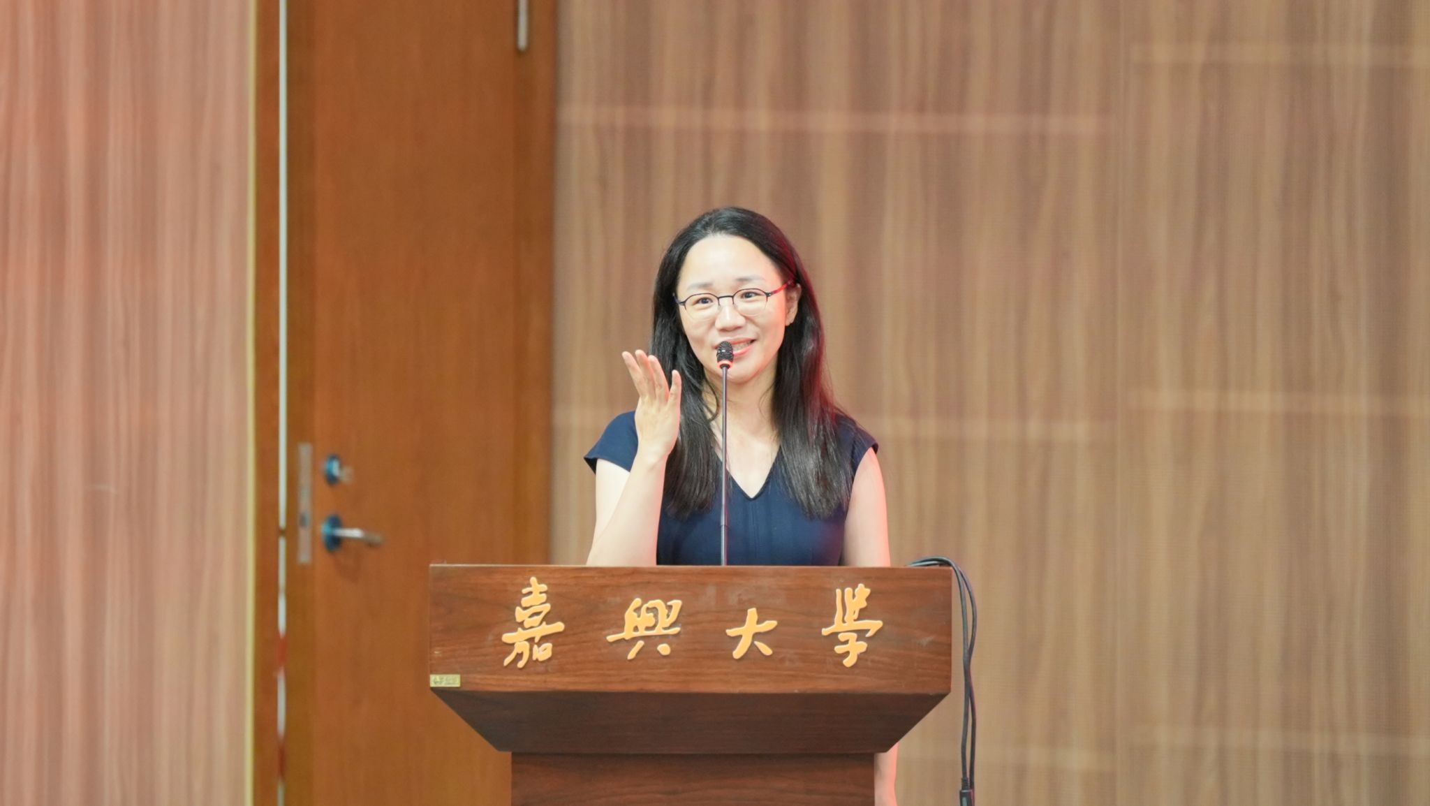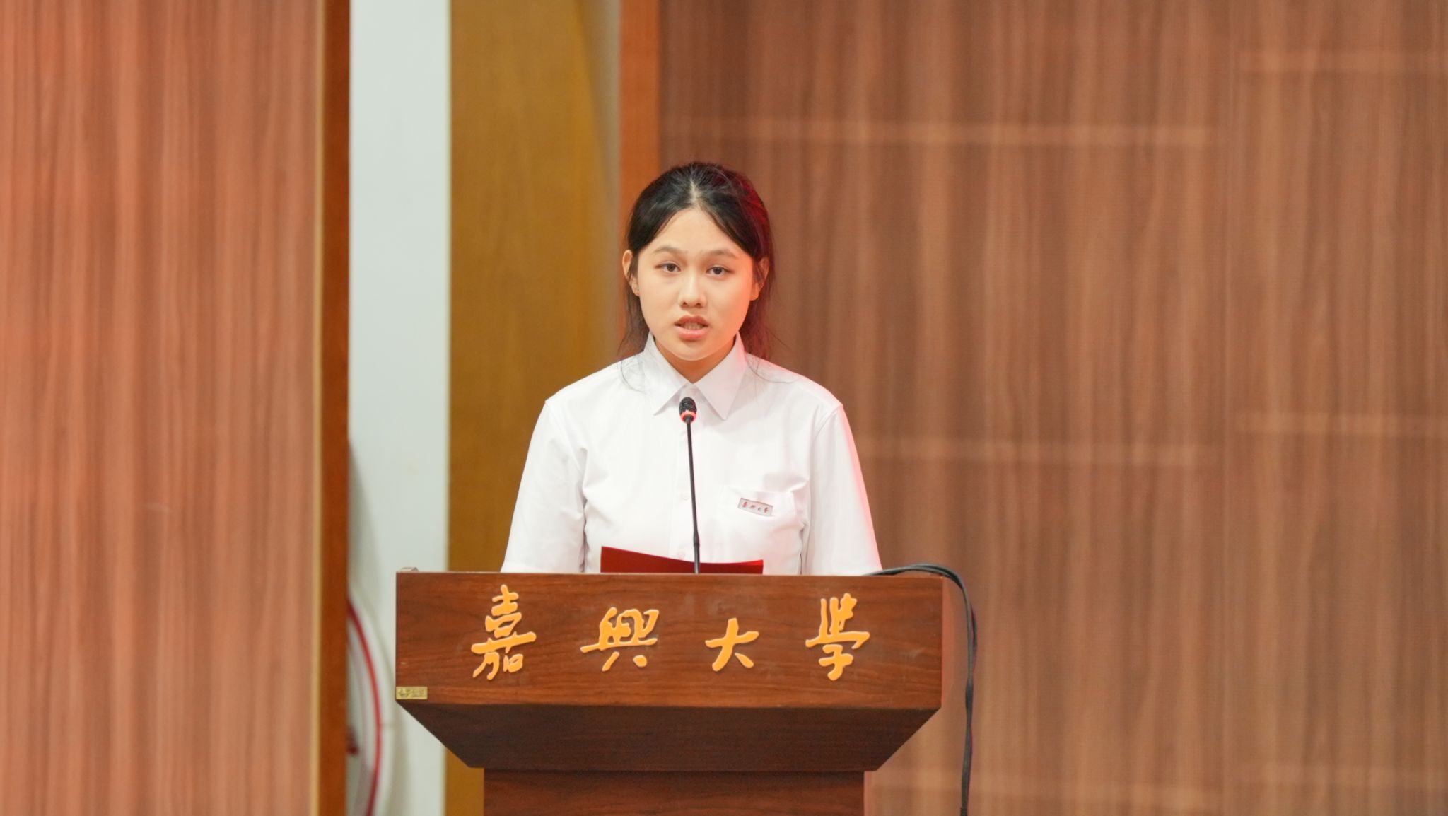 校友代表、日语2009届校友、嘉兴市杉惠服饰有限公司创始人、总经理张丹结合当年自己在校期间的学习经历和毕业后的工作创业感受对在座新生提出寄语,她希望学弟学妹们珍惜大学时光,多读书、多交友、多运动,在端正态度踏实学习之余,培养一两项受益终身的体育运动的爱好,不畏艰难、不畏世俗、勇敢向前。