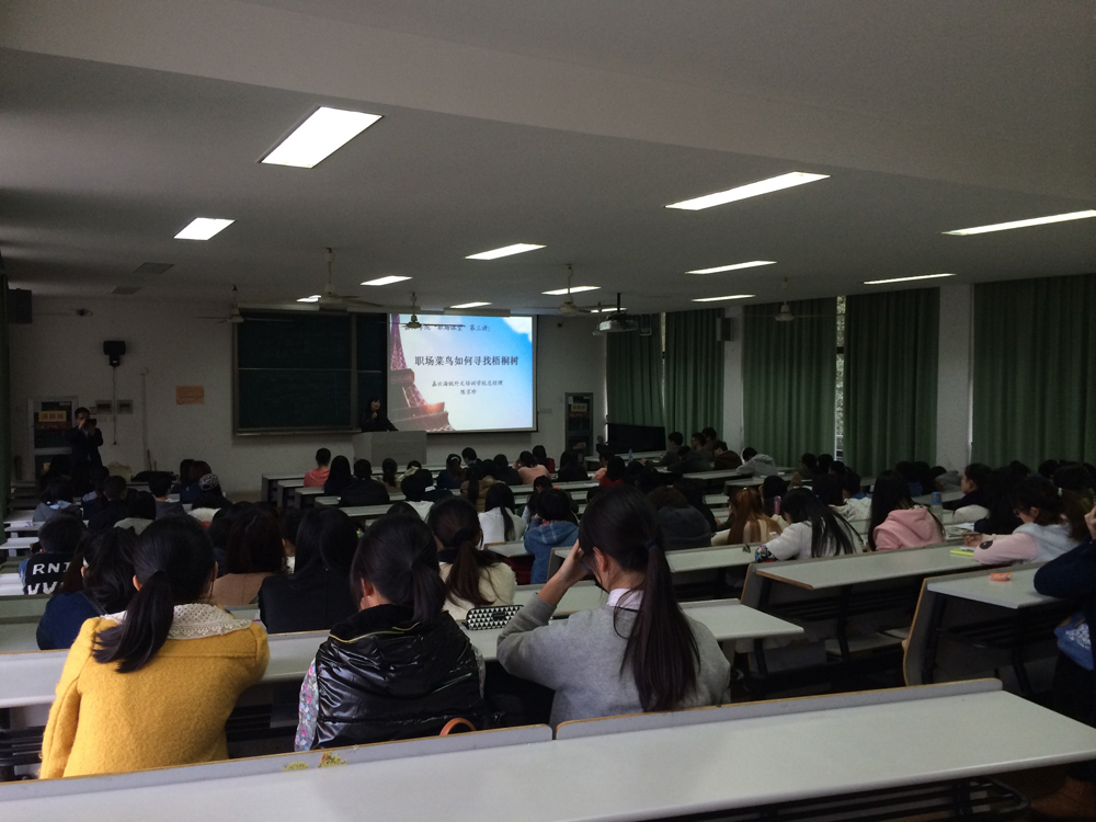 11月27日下午3:30分,由外国语学院承办的嘉兴学院“职场课堂”第三讲在教二A225举行。此次“职场课堂”邀请到了嘉兴市海锐外文培训学校总经理陈京珍主讲。
