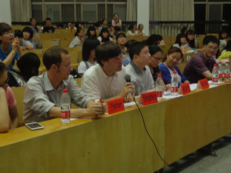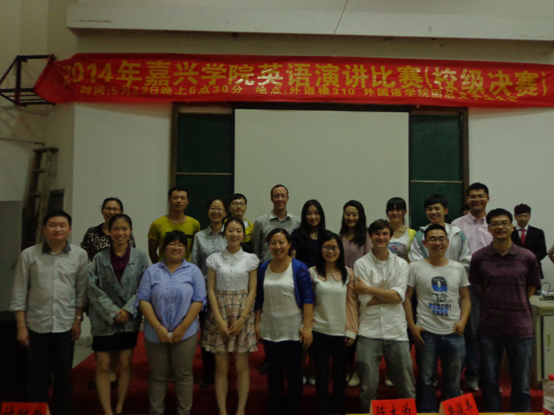 2014年嘉兴学院大学生英语演讲比赛于5月23日晚在外国语学院外语楼310教室举行。经过初赛和复赛的激烈比拼,来自嘉兴学院各二级分院的同学共有25名选手(实到23人,2人弃权)脱颖而出进入决赛。本次比赛由外国语学院陶丹玉、钱征宇、张静、鲁俊丰、陈大为老师和外教Peter及Stephen担任评委。