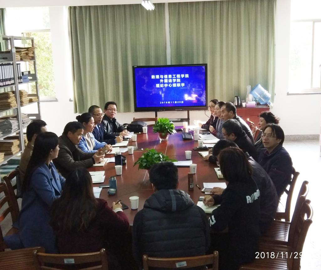 11月29日下午,外国语学院与数理与信息工程学院党委理论中心组开展联合学习活动。此次会议主题是“学习贯彻市委八届四次全会精神,助推学校‘三步走’发展战略”。会议由外国语学院党委书记陶丹玉主持,两个单位全体理论学习中心组成员参加。