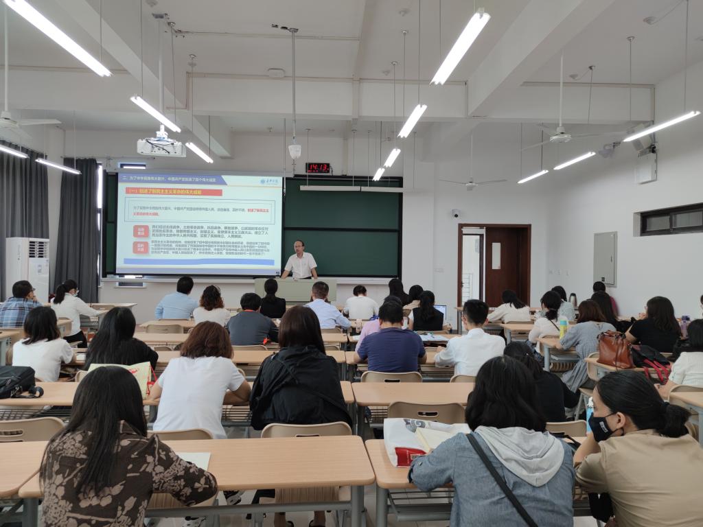 杨培强副校长从实现第一个百年奋斗目标全面建成小康社会、中国共产党创造的四个伟大成就、继承伟大的建党精神,以史为鉴开创未来的九个方面要求、全面贯彻“一国两制”方针和坚持“九二共识”以及全体党员要继续为实现人民对美好生活的向往不懈努力等六大方面,对习近平总书记在庆祝中国共产党成立100周年大会上的重要讲话精神的丰富内涵进行深入阐述,运用大量详实的历史资料介绍了中国共产党从诞生到进入中国特色社会主义新时代的奋斗历程,并且从科学判断是制定政策的前提、认清国情是制定政策的基础、坚持解放思想、勇于理论创新和正确处理改革、发展和稳定的关系四个方面全面总结了党的基本建设经验。
