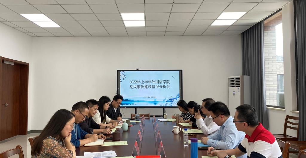 6月13日下午,外国语学院2022年上半年党风廉政建设情况分析会在兴德楼南楼516会议室召开,副校长周宏伟出席会议,学院党政领导班子、党委委员、特约监察员、科研秘书等参加会议。会议由学院党委书记周钰主持。