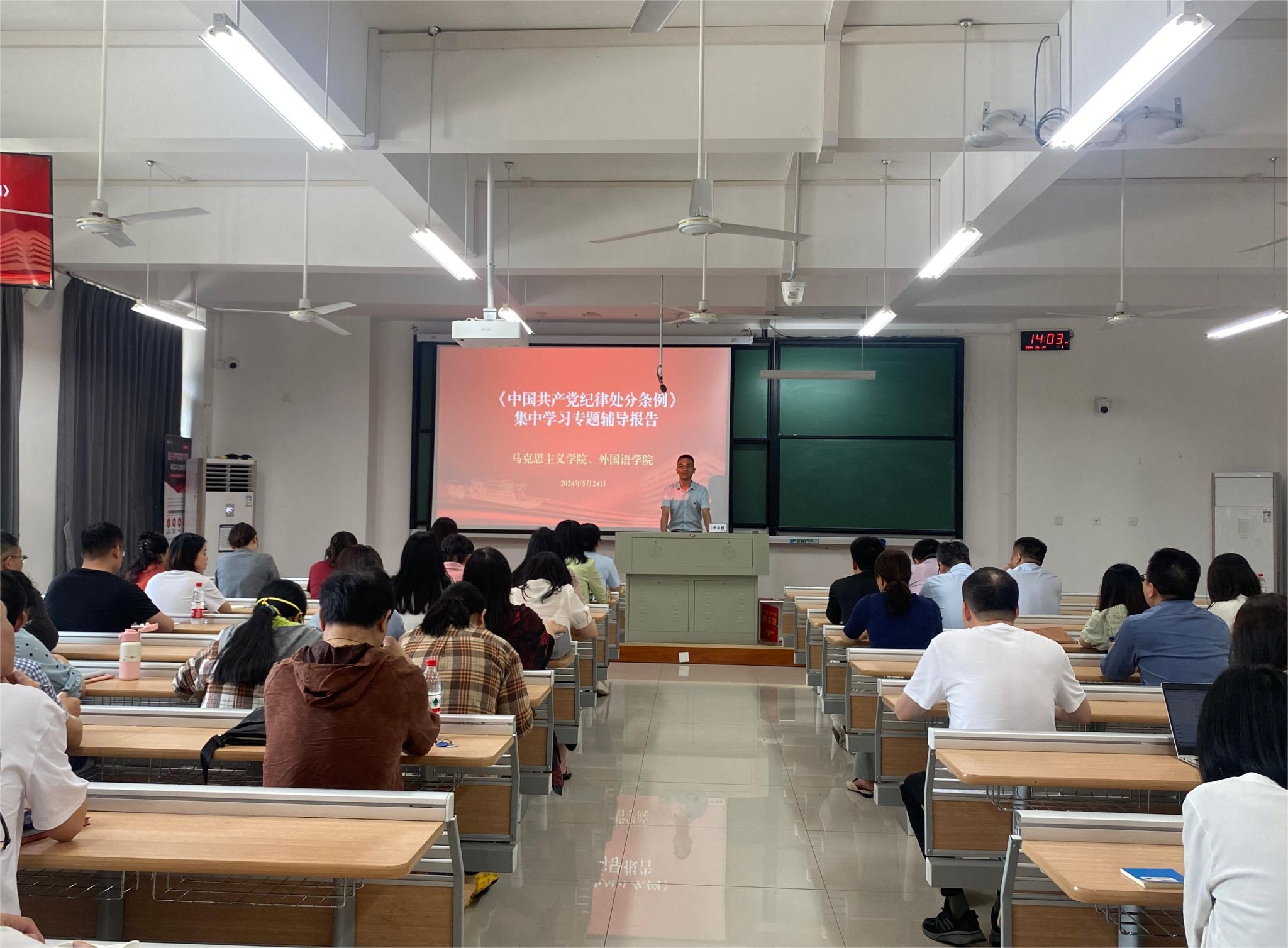 2024年5月24日下午,外国语学院党委联合马克思主义学院党委,特邀浙江红船干部学院李益模副教授做党纪学习教育专题讲座。讲座由马克思主义学院党总支书记宋之霞主持,两院党员教师参加本次讲座。