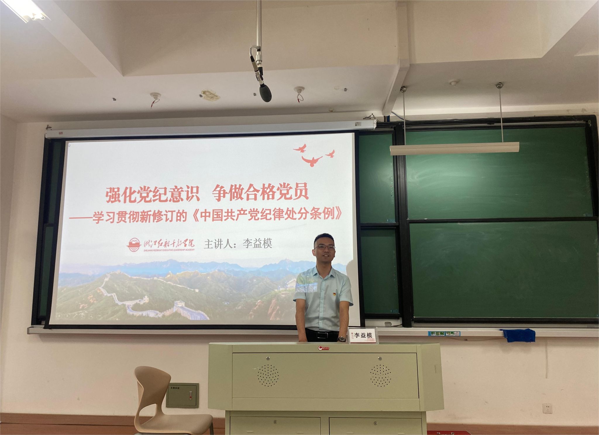 李益模副教授的讲座主题为“强化党纪意识,争做合格党员——学习贯彻新修订的《中国共产党纪律处分条例》”,重点从“为什么:重要意义”、“是什么:主要内容”、“怎么办:实践要求”等三个方面展开论述,强调纪律严明是我们党的优良传统和政治优势,加强纪律建设是全面从严治党的治本之策,加强纪律建设是解决现实问题的客观需要。李教授详细解读了本次修订内容分布和新旧条例对比,通过生动形象的违纪反面案例说明了党内对违反政治纪律、组织纪律、廉洁纪律、群众纪律、工作纪律、生活纪律行为的不同处分方式。