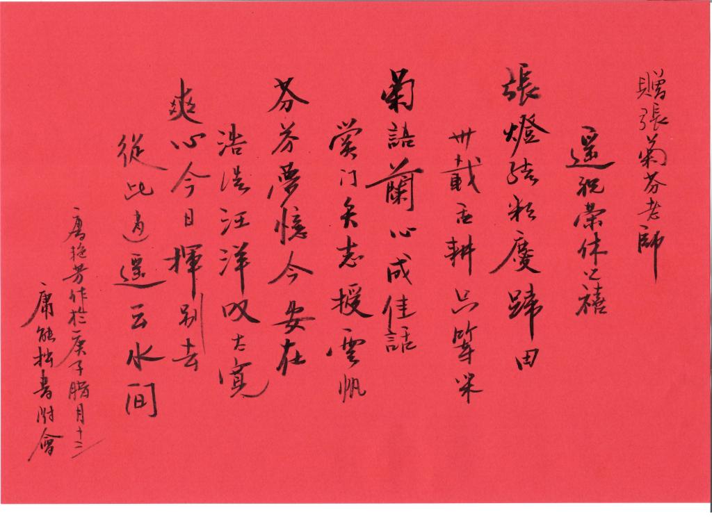 在大家的热烈而持久的掌声中,学院领导向任玉琴和陆珠希两位老师送上鲜花和纪念品,并向远在美国的张菊芬老师送上深深的祝福。唐艳芳院长即兴创作了三首藏头诗,作为欢送老师们的珍贵礼物,并由喻锋平副院长和郭永恩副院长挥毫泼墨、亲自赠上。