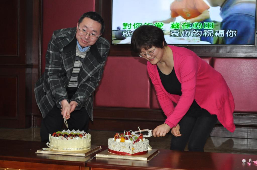我们外国语学院的女老师永远是充满活力的。还没等活动开始,张静老师自己先和乔艳霞老师开启麦霸模式开始了深情对唱。乔老师一首不够又加演了一首!那婉约深情的少女天籁之声让人无论如何和也很难和运动场上的乔老师联系在一起。春不仅意味着生命还意味着色彩!今天的张艳琴老师上身一件外粉内白的绒外套,下身一条灰色铅笔裤,春的气息扑面而来。郭院长说我们张艳琴老师是藏于民间的歌唱高手,果然每次听张老师唱歌恍然间以为在听“王菲”专场。“好!我们首先请各位介绍一下自己的生日吧!”...“我其实是9月生的...”还没等乔老师说完,大家都被逗乐了。“下面介绍一下我们的一位新老人潘宁宇老师!”“我的生日是3月13日!我不知道说什么好!但回到外院让我觉得很亲切!”潘老师简洁的介绍配上他的娃娃脸让女老师们都忍俊不禁!“好!下面我们进入切蛋糕环节!”随着“永远18”生日蛋糕的点亮,活动进入了高潮!郭院长、黄洪和莫岚老师三位“记者”同时按下了快门,留下了最美好的三月!