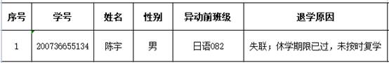 根据《普通高等学校学生管理规定》(中华人民共和国教育部令第41号)中关于学籍管理的相关条款,外国语学院日语082班陈宇同学休学期满,在学校规定期限内未提出复学申请,经外国语学院党政联席会议研究,该同学(详细信息见附表)已达到退学条件,决定提交学校校长办公会议,拟按照退学处理,特此公告。