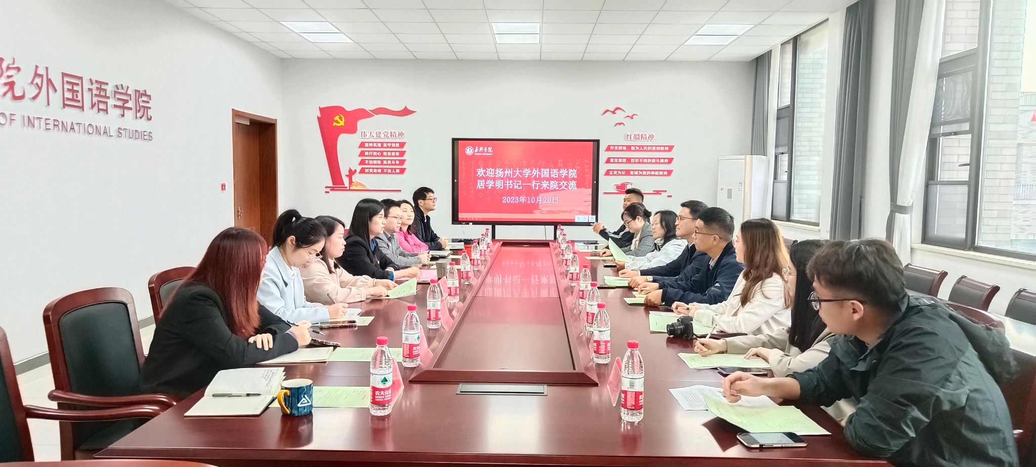 10月20日下午,扬州大学外国语学院党委书记居学明一行9人来院交流党建工作。外国语学院党委书记周钰,各支部书记、委员参加交流会。