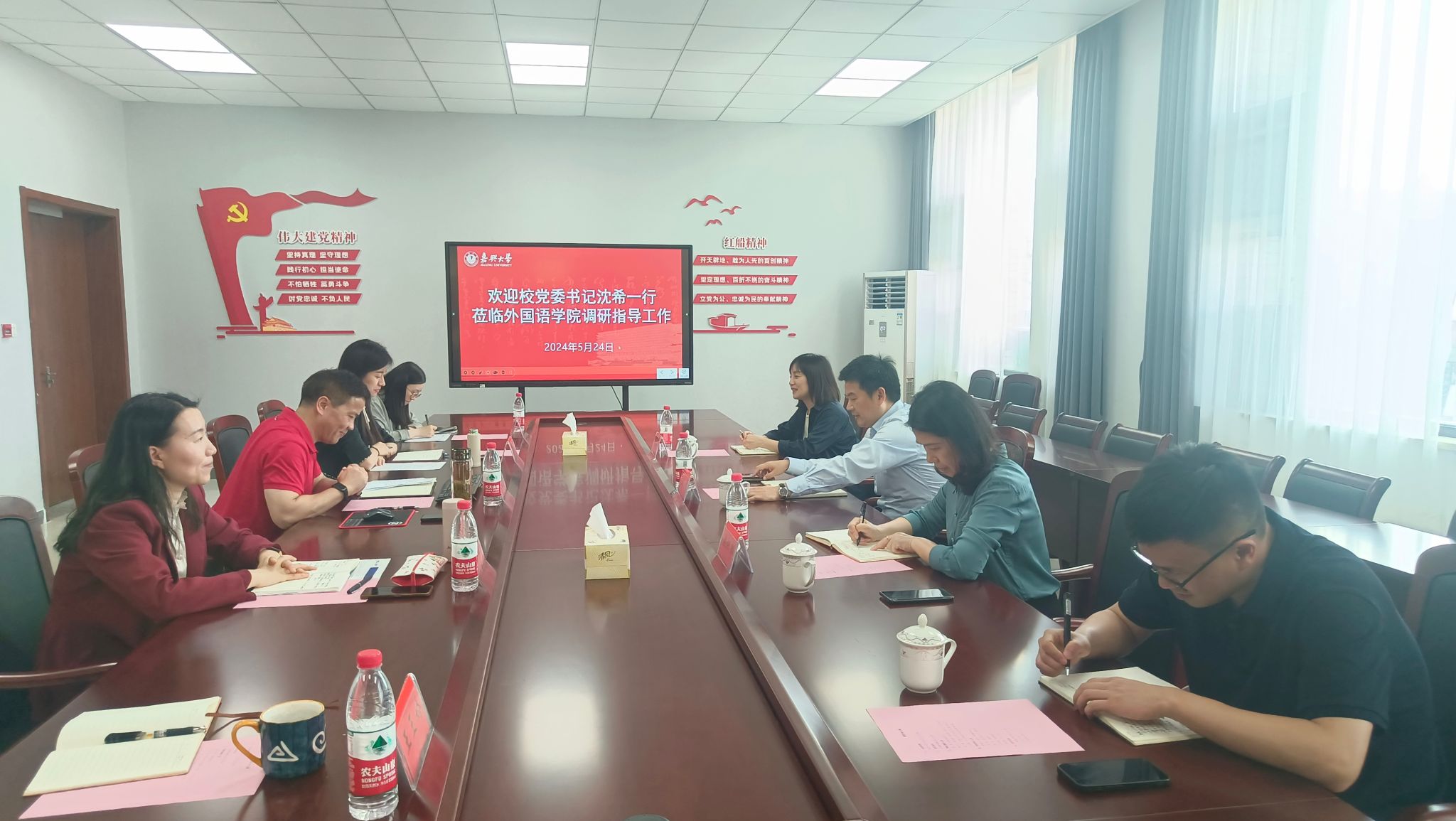 5月24日下午,校党委书记沈希来外国语学院调研指导工作,学院党政领导班子成员参加座谈。