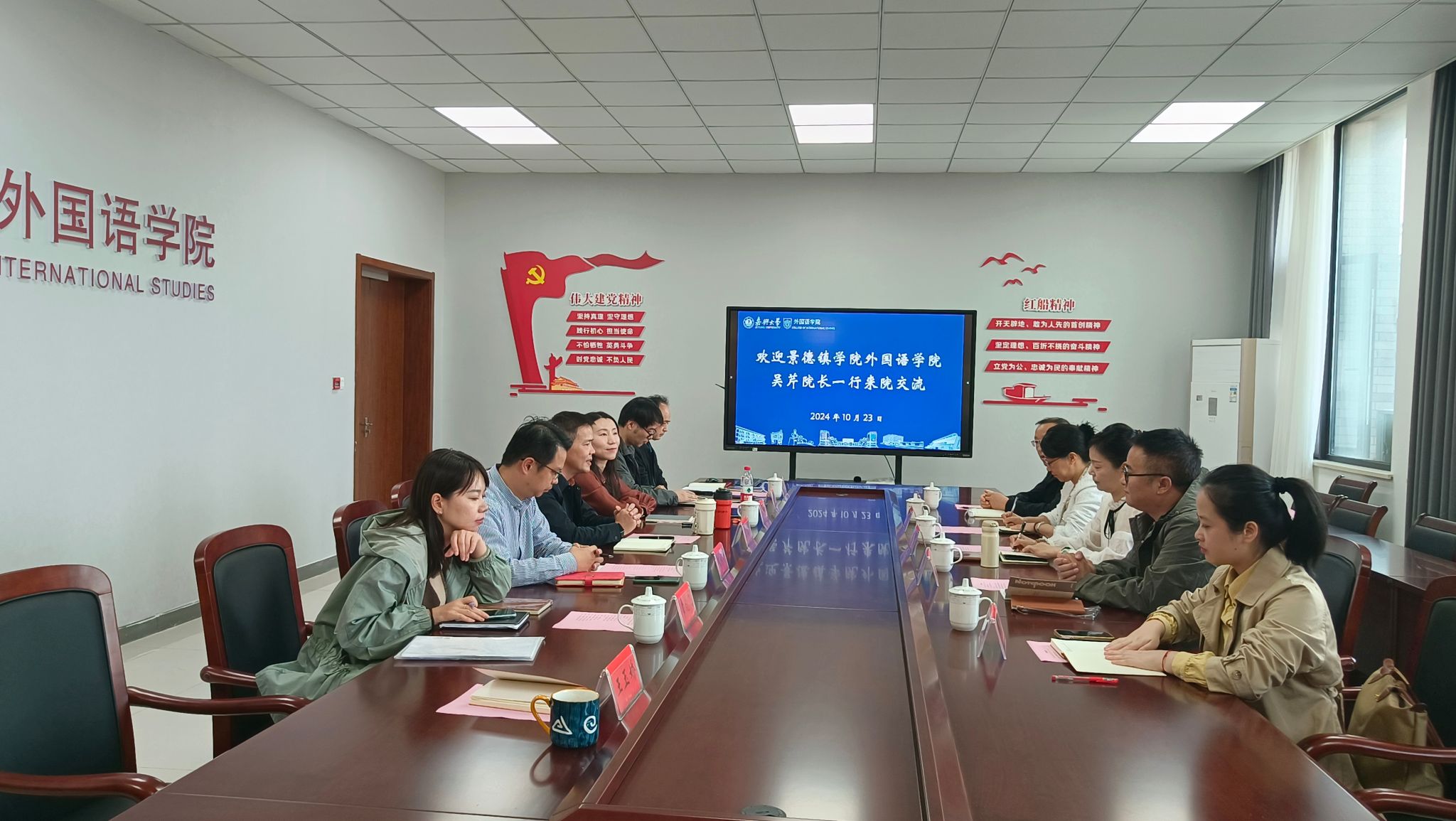 10月23日,景德镇学院外国语学院院长吴芹一行5人来院调研交流。院长唐艳芳、副院长邱佳、党委副书记张啸峰及学院骨干教师参加交流会。