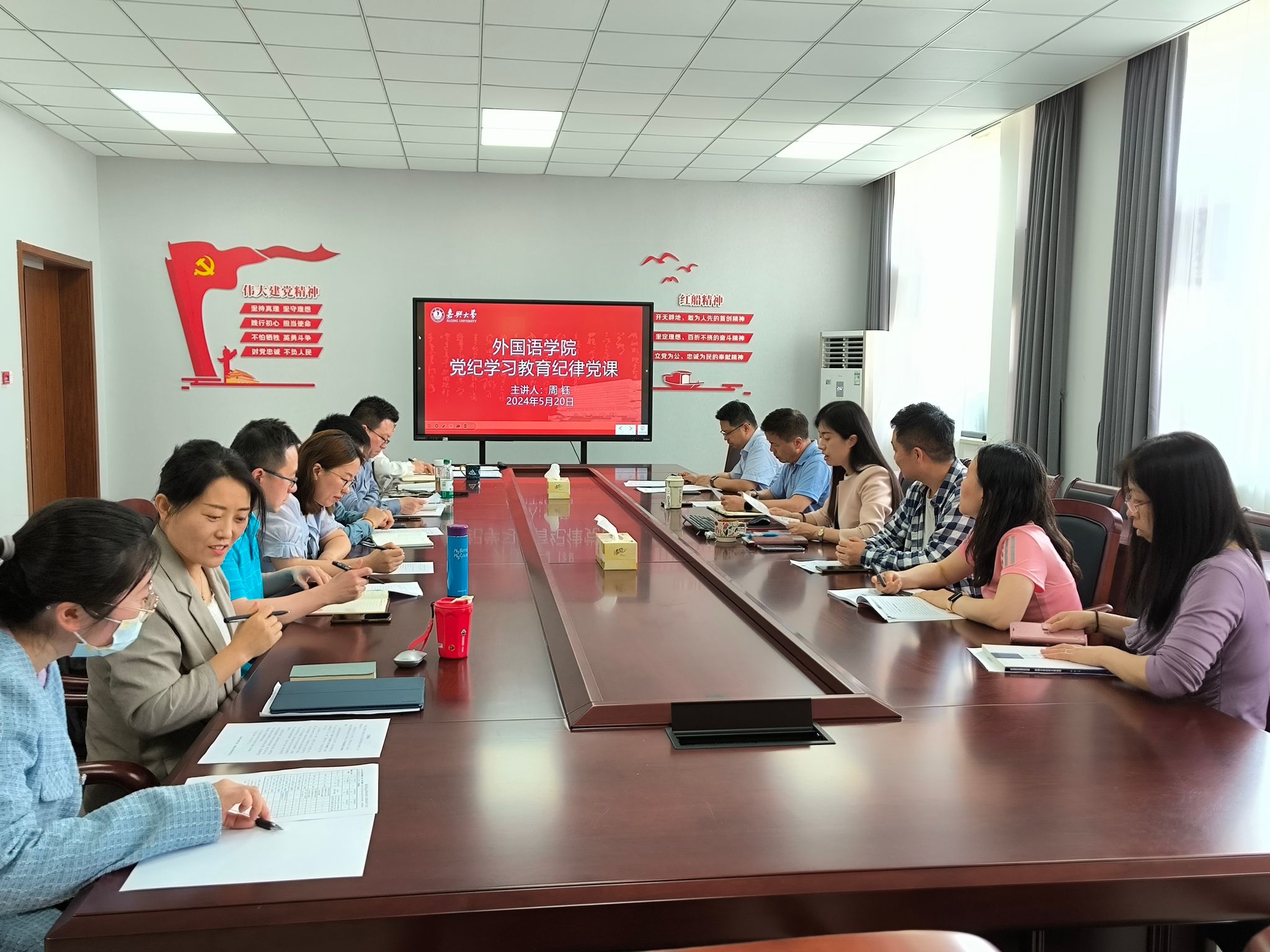 5月20日下午,外国语学院在兴德楼南楼516举行党委(扩大)会议暨党纪学习教育纪律党课。纪律党课由学院党委书记周钰主讲,学院党政领导班子、科级干部、党支部书记和系部主任参加学习会。