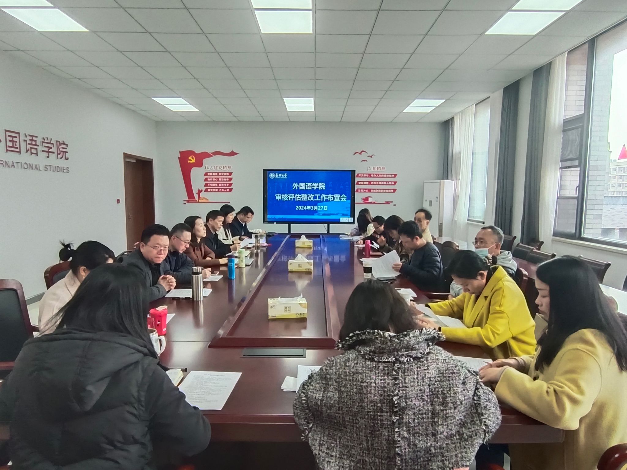 3月27日下午,外国语学院在兴德楼南楼516会议室召开本科教育教学审核评估整改工作布置会。学院党政领导班子成员、专业负责人、系部正副主任、教研室主任、教学督导和教学管理人员参加会议,会议由院长唐艳芳主持。