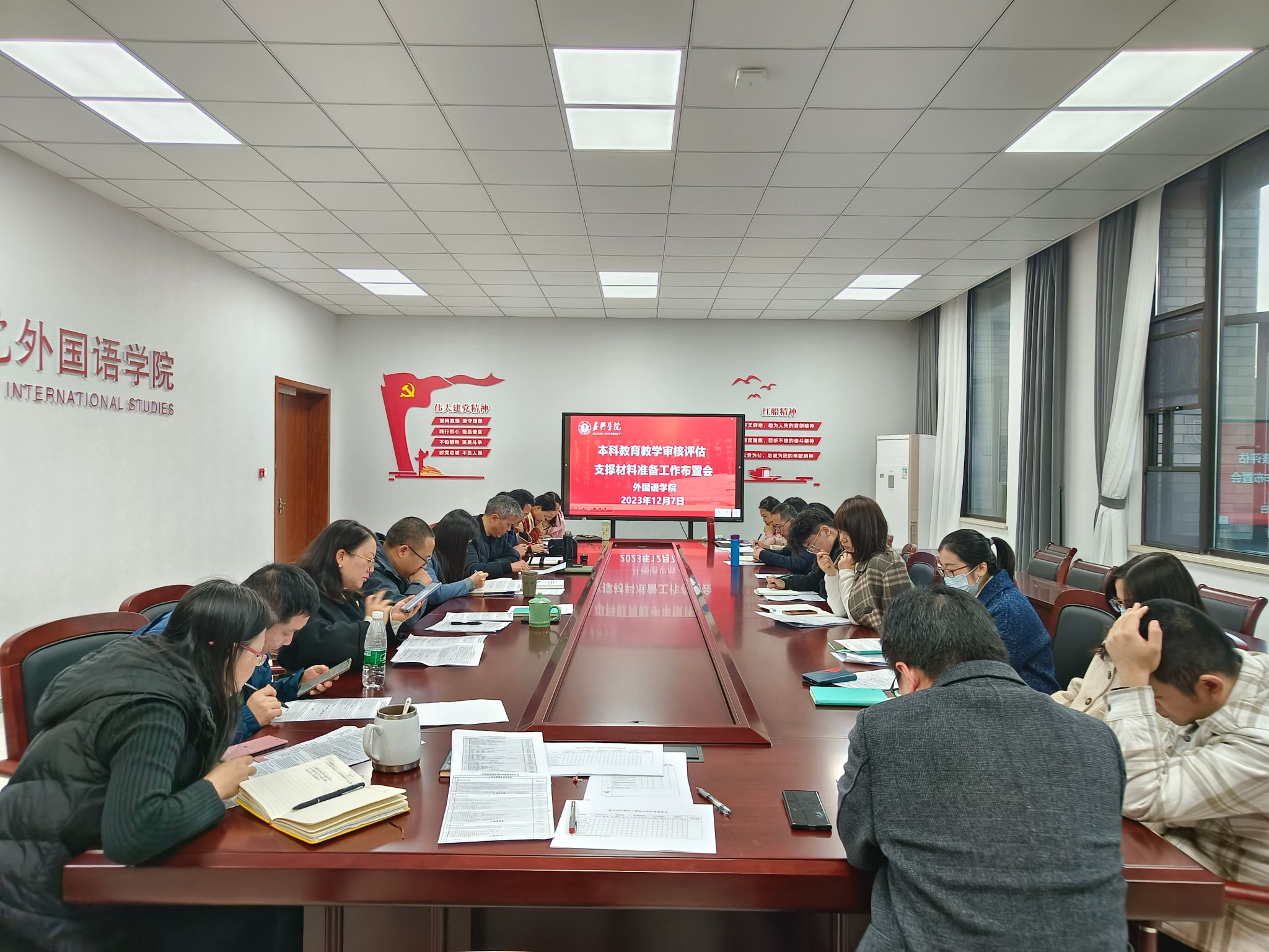 12月7日下午,外国语学院在兴德楼南楼516会议室召开本科教育教学审核评估支撑材料准备工作布置会。学院党政领导班子成员、专业负责人、系部主任、专业骨干教师以及各行政办公室人员参加会议,会议由副院长喻锋平主持。